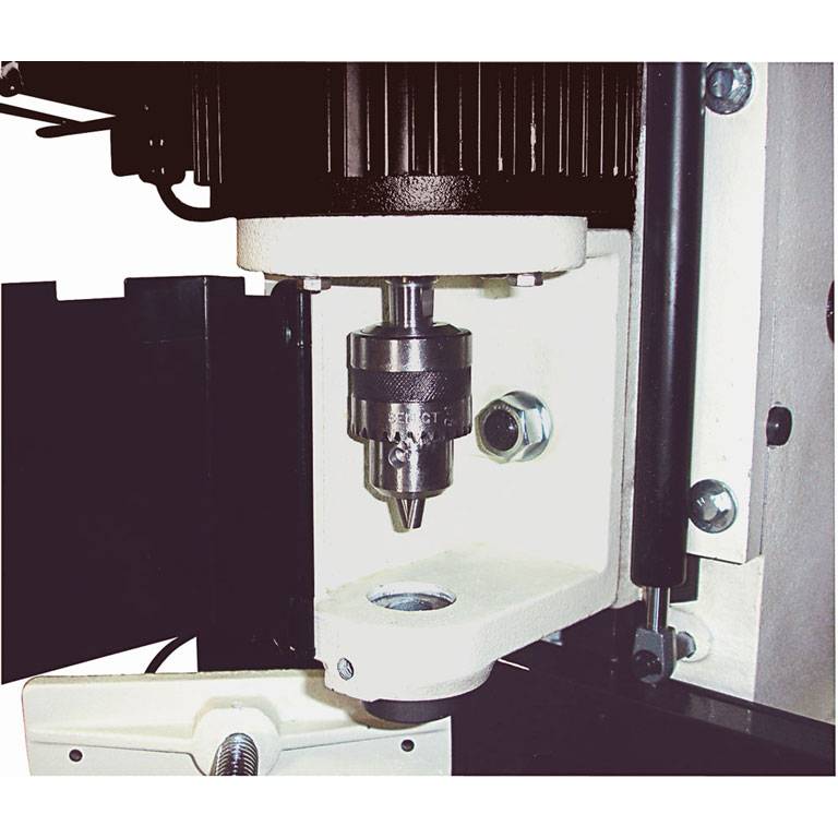 Важно, что конструкция со съемным столом совмещается с возможностью подачи сверлильно-долбежной части по осям. Крестообразные направляющие координатного механизма располагаются в основании колонны, подача производится при помощи рычагов. Для работы с серийными изделиями предусмотрены настраиваемые ограничители хода по осям и торцевой упор заготовки.