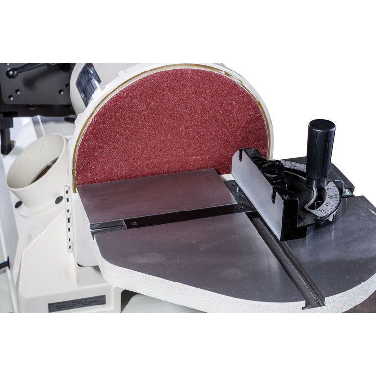 Тарельчато-шлифовальный узел состоит из алюминиевого диска с креплением абразивных листов на «липучке» и чугунного рабочего стола. В его поверхности предусмотрено два перпендикулярных Т-образных паза для работы с угловым упором или устройством для шлифования по кругу. Стол имеет механизм точной регулировки по углу наклона с транспортирной шкалой.