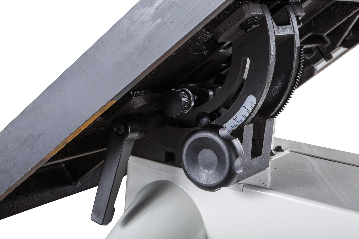 - Регулировка наклона пильного стола вращением рукоятки