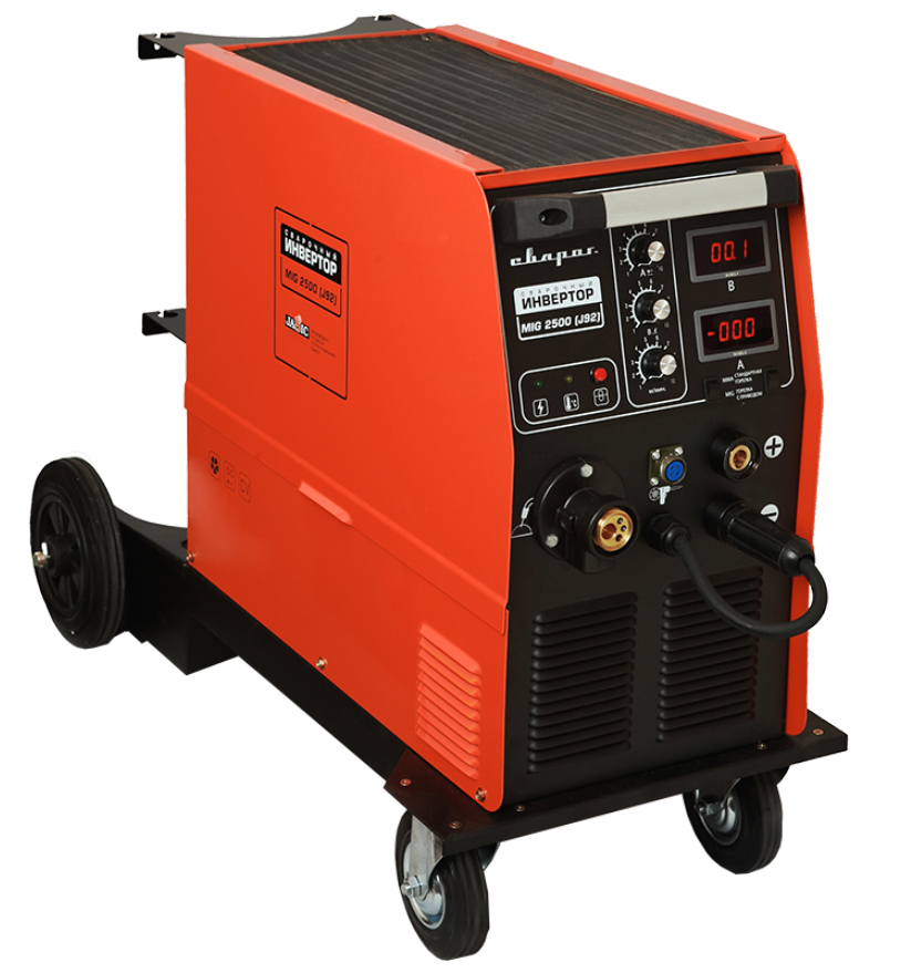 Модель серии STANDART MIG 2500 (J92) предназначена для механизированной сварки в среде защитного газа (MIG/MAG) и ручной дуговой сварки покрытым электродом (ММА). Режим обратной полярности позволяет также осуществлять сварку порошковой проволокой (FCAW) без защитного газа. Для удобства использования аппараты оснащены тележкой с поворотными колесами, на которую также устанавливается баллон с газом.